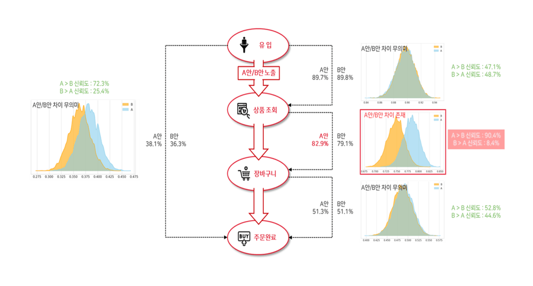 온사이트 마케팅 퍼널 데이터 분석을 위해 데이터 수집 체계를 개선했습니다. 비즈니스 퍼널에 최적화된 맞춤형 이벤트를 설계 및 추적하여, 퍼널 효율 개선을 위한 실질적인 액션 아이템을 도출했습니다. 또한 확률분포 관점의 A/B Test를 통해 UI 요소의 영향도를 정량적으로 분석함으로써, 데이터에 기반한 UI/UX 개선 근거를 마련하고 의사결정을 지원했습니다.